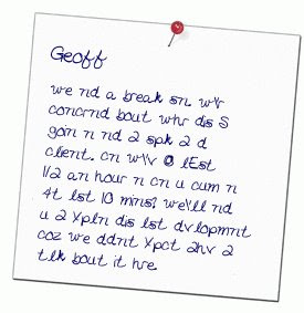 Geoff, we nd a break sn. w'r concrnd bout whr dis S goin n nd 2 spk 2 d client. cn w'v @ lEst 1/2 an hour n cn u cum n 4t lst 10 mins? we'll nd u 2 Xpln dis l8st dvlopmnt coz we ddnt Xpct 2hv 2 tlk bout it hre.